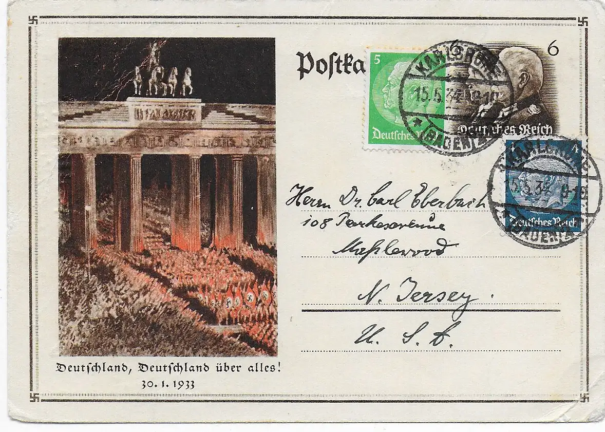 Ganzsache Karlsruhe zur Machtergreifung nach USA - New Jersey