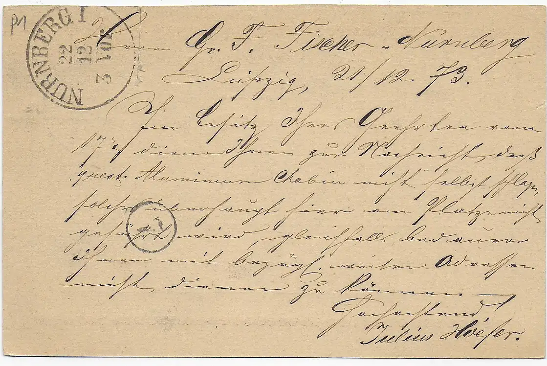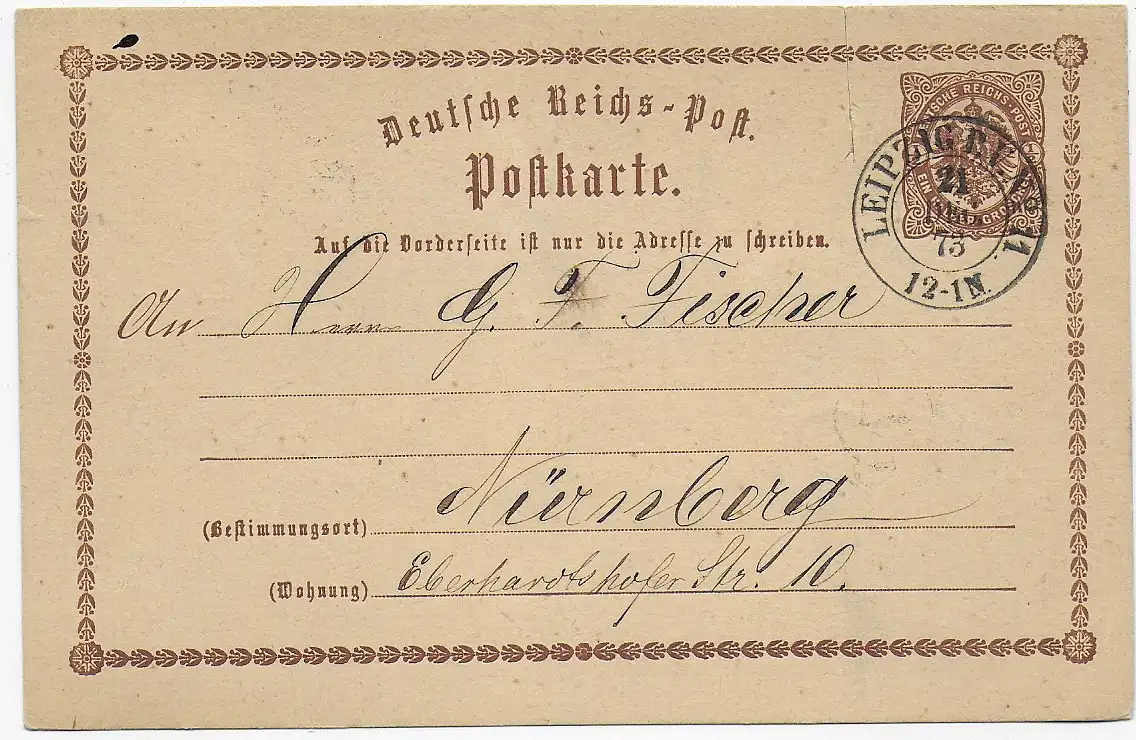 Ganzsache Leipzig 1873 nach Nürnberg, oben Einschnitt