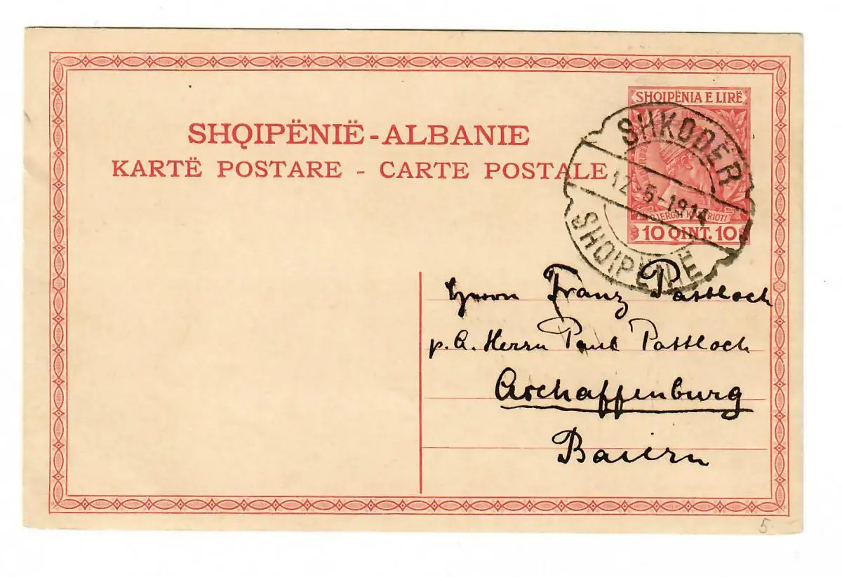 Ganzsache Shkoder nach Aschaffenburg 1914