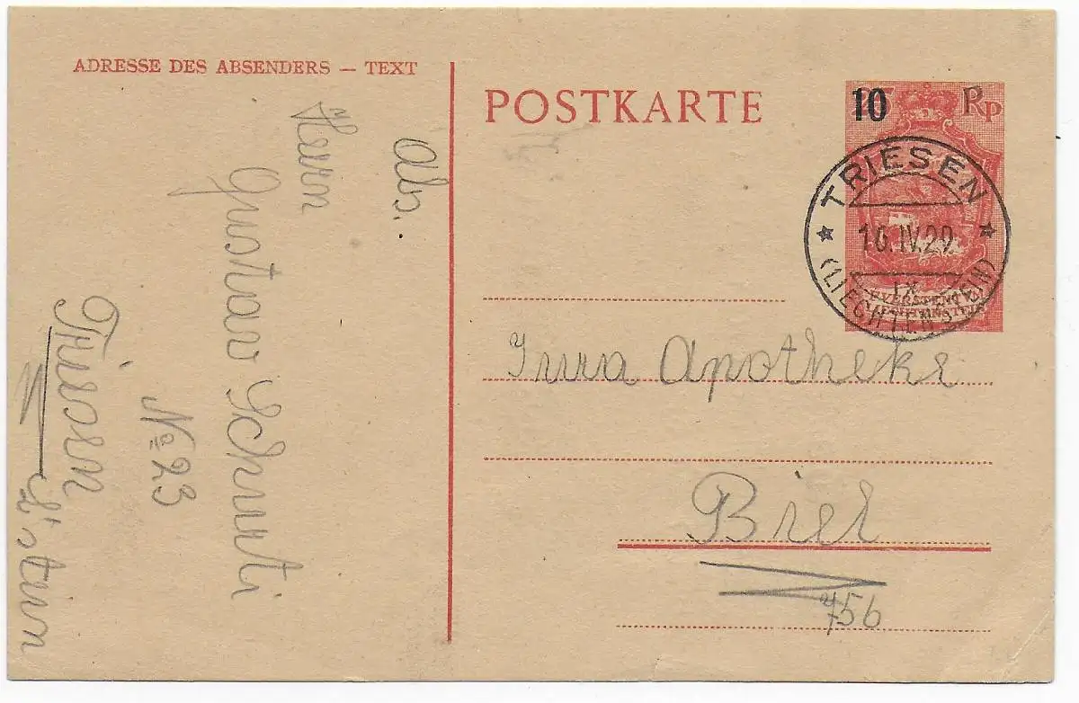 Ganzsache Triesen 1920 nach Briel, MiNr. P5