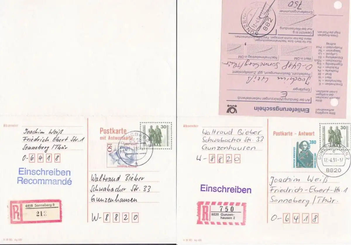 Ganzsache mit Antwort beide Teile je Einschreiben mit entspr. Zusatzfrankatur, Sonneberg / Gunzenhausen Sophie Scholl