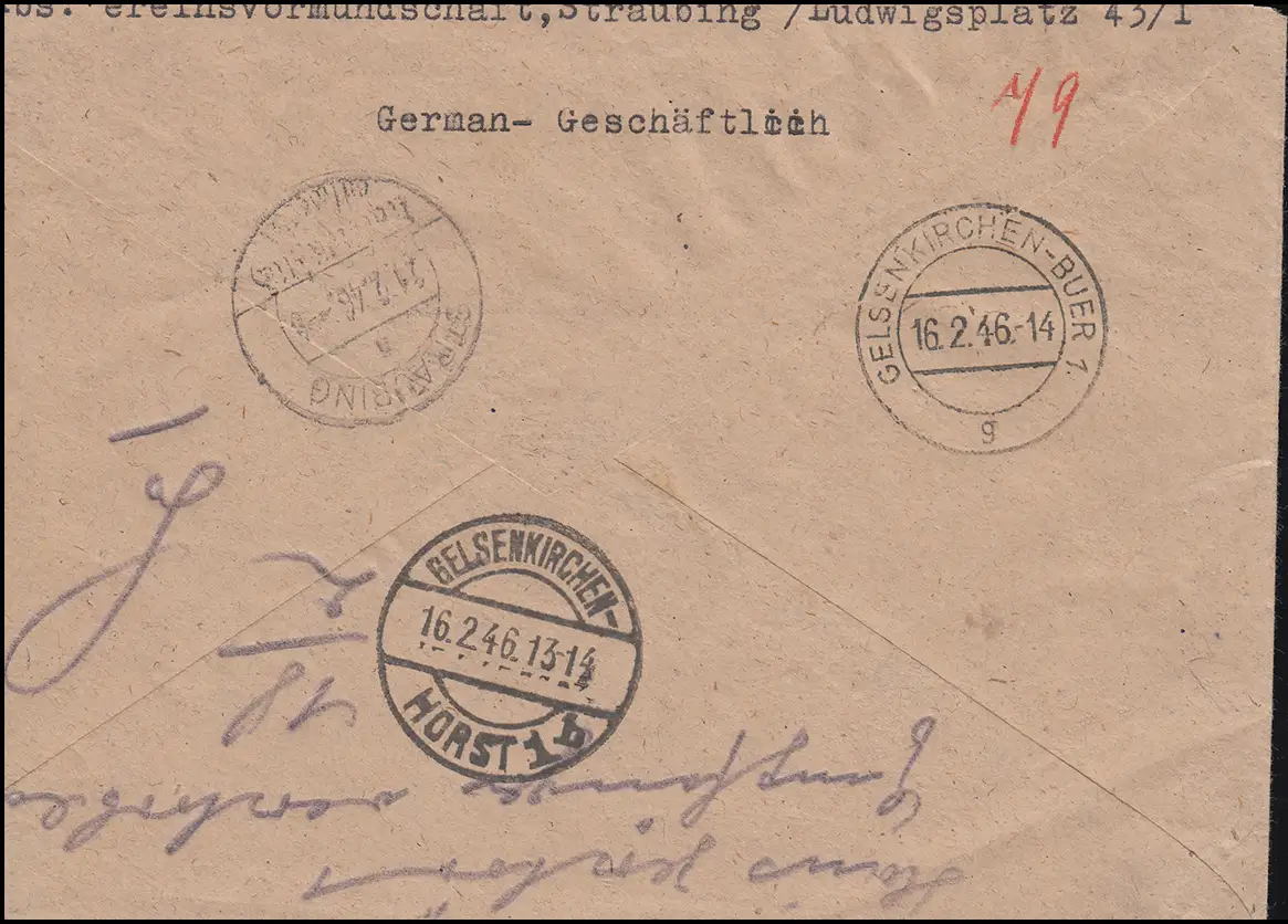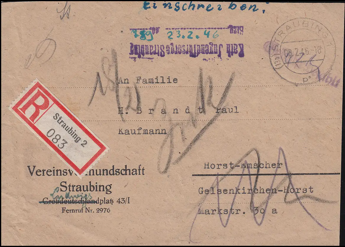 Einschreiben von der Vereinsvormundschaft Straubing über GELSENKIRCHEN-HORST 16.2.46 nach GELSENKIRCHEN-BUER 16.2.46 und zurück mit Eingangsstempel Kath. Jugenfürsorge Straubing (23.2.46)