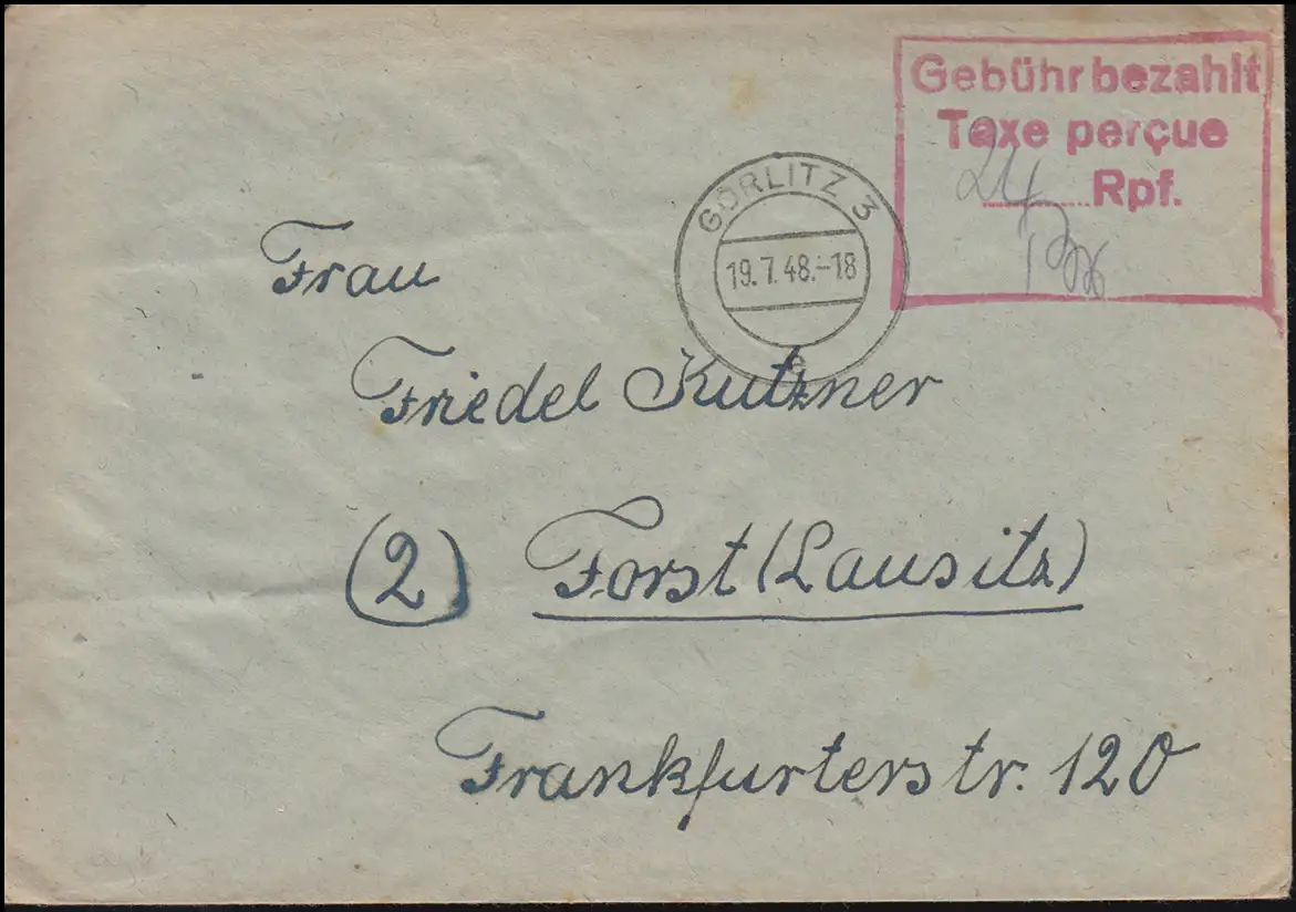 Gebühr-Bezahlt-Stempel mit Taxe percue (24) Rpf. auf Brief GÖRLITZ 19.7.1948