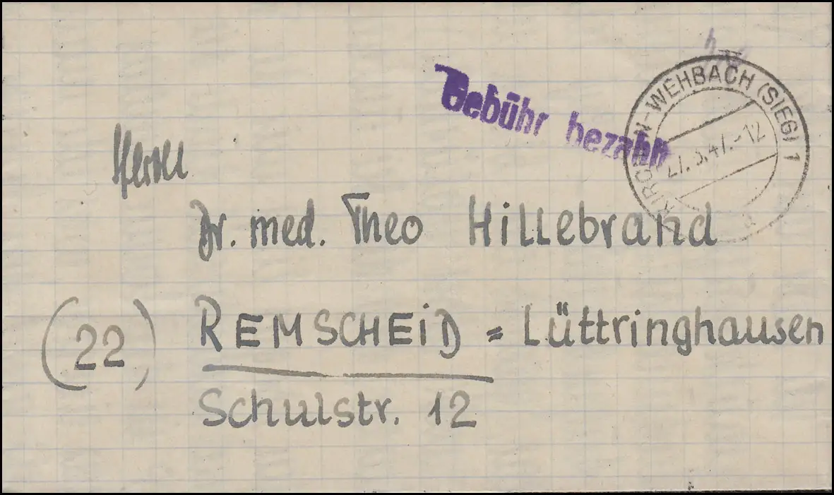 Gebühr-Bezahlt auf Falt-Brief KIRCHEN-WEHBACH / SIEG 27.3.27 nach Remscheid