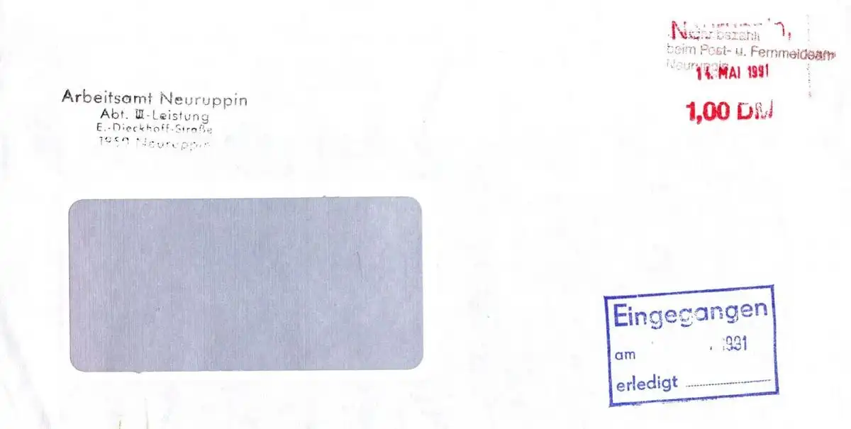 • MichSeite Gebühr-bezahlt-Beleg mit rotem Stempel "Neuruppin / 14. MAI 1991 / 1,00 DM", Ganzstück Beschreibung \nAusgabeland: Bundesrepublik Deutschland Herausgeber: Deutsche Post AG, Bonn \nAusgabeanlass: Behördenpost des Arbeitsamtes Neuruppin, Gebühr-bezahlt-Beleg mit rotem Stempel "Neuruppin / 14. MAI 1991 / 1,00 DM" Katalognummer: - Ausgabedatum: 1991 Nominale: 1,00 DM \nTyp: - \nErhaltung: Ganzstück (Umschlag) Zudruck: - \nHinweis: - Thema: -