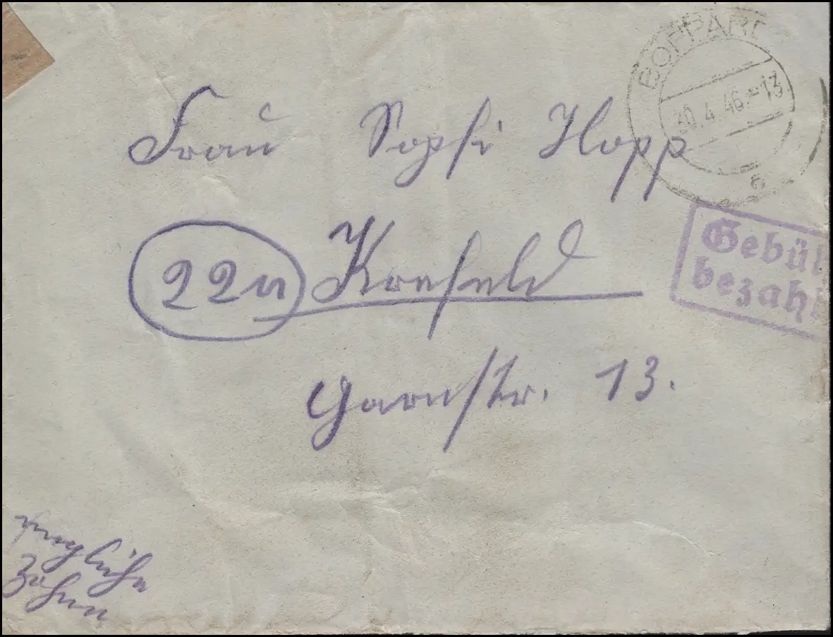 Gebühr-bezahlt-Stempel auf Brief BOPPARD 30.4.1946 nach Krefeld