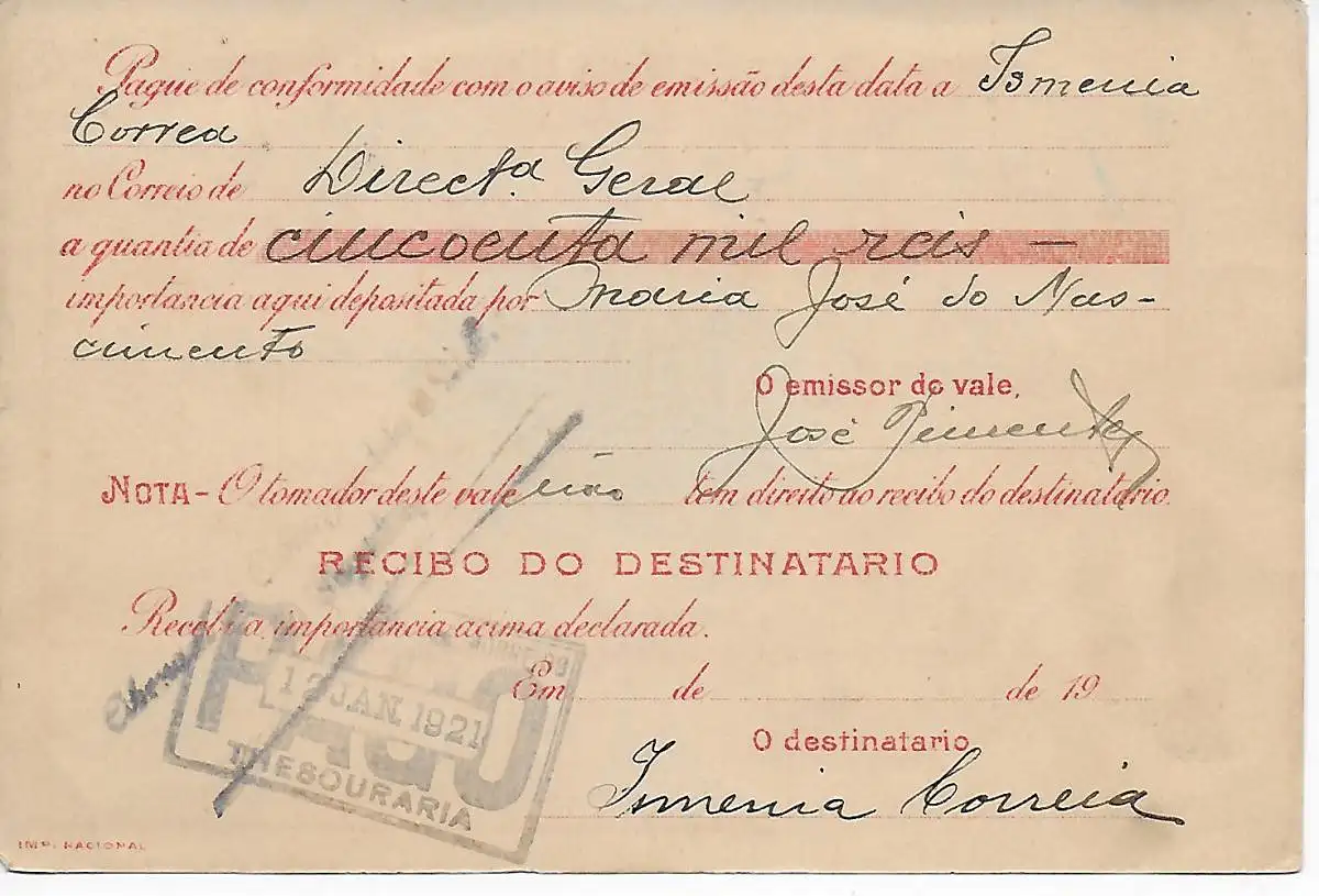 Geldanweisung Brasilien, 1920, Thesouraria
