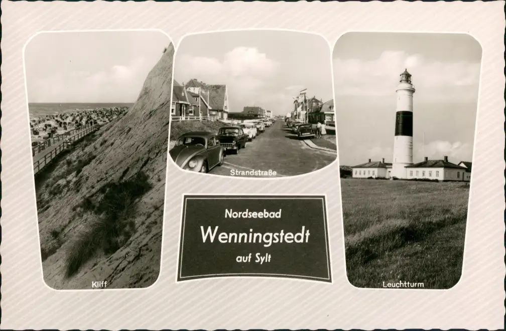 Gemeinde Sylt Mehrbild-AK mit Kliff, Autos in der Strandstraße, Leuchtturm 1955