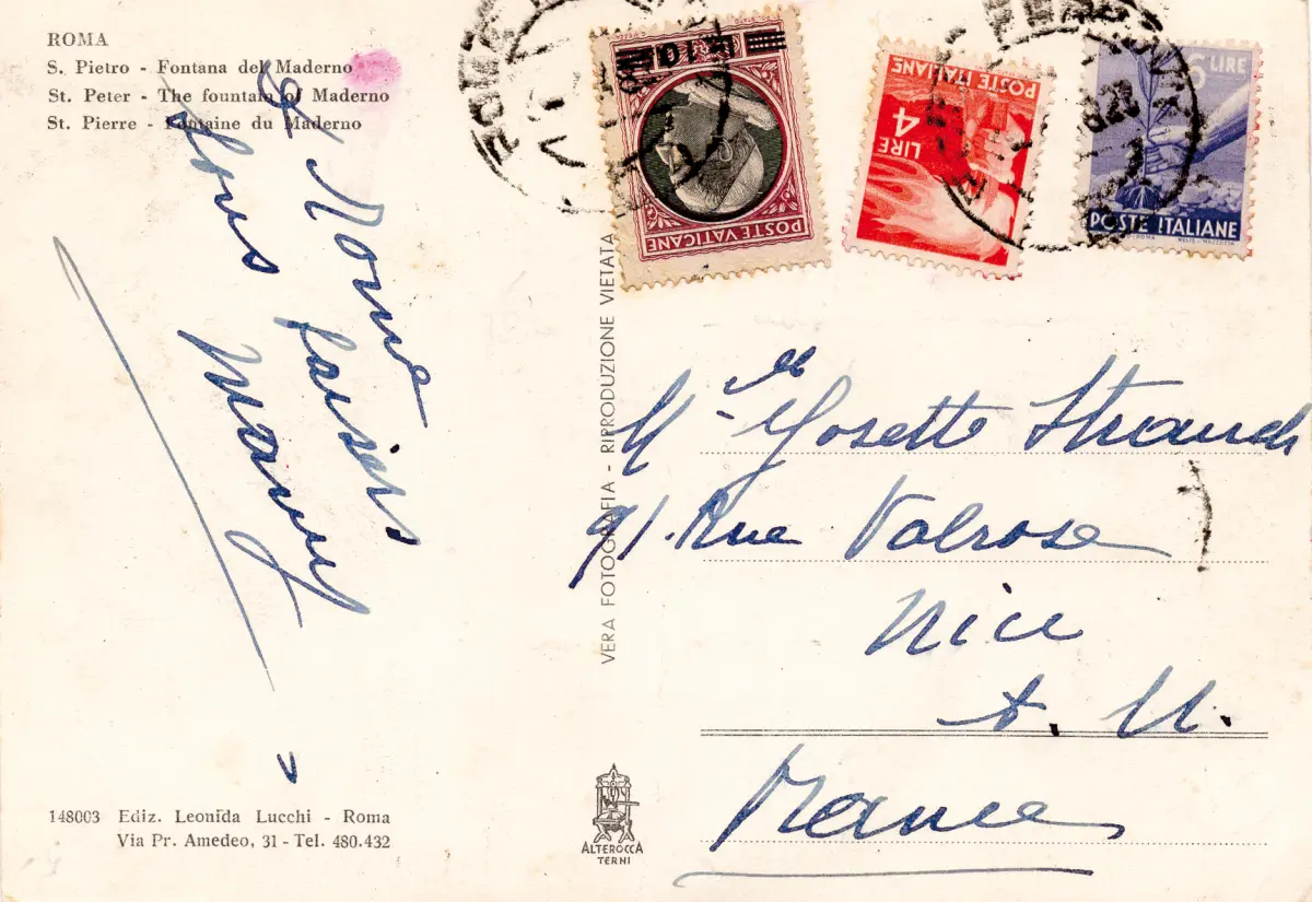 Postkarte - Gemischt Italien/Vatikan - Vordruckkarte verschickt von Rom nach Frankreich am 3.4.48 frankiert Lire 20 mit Vatikan Nr. 108 + Democratica Lire 4 + 6 - Ungewöhnlich Cod. 1008/17
