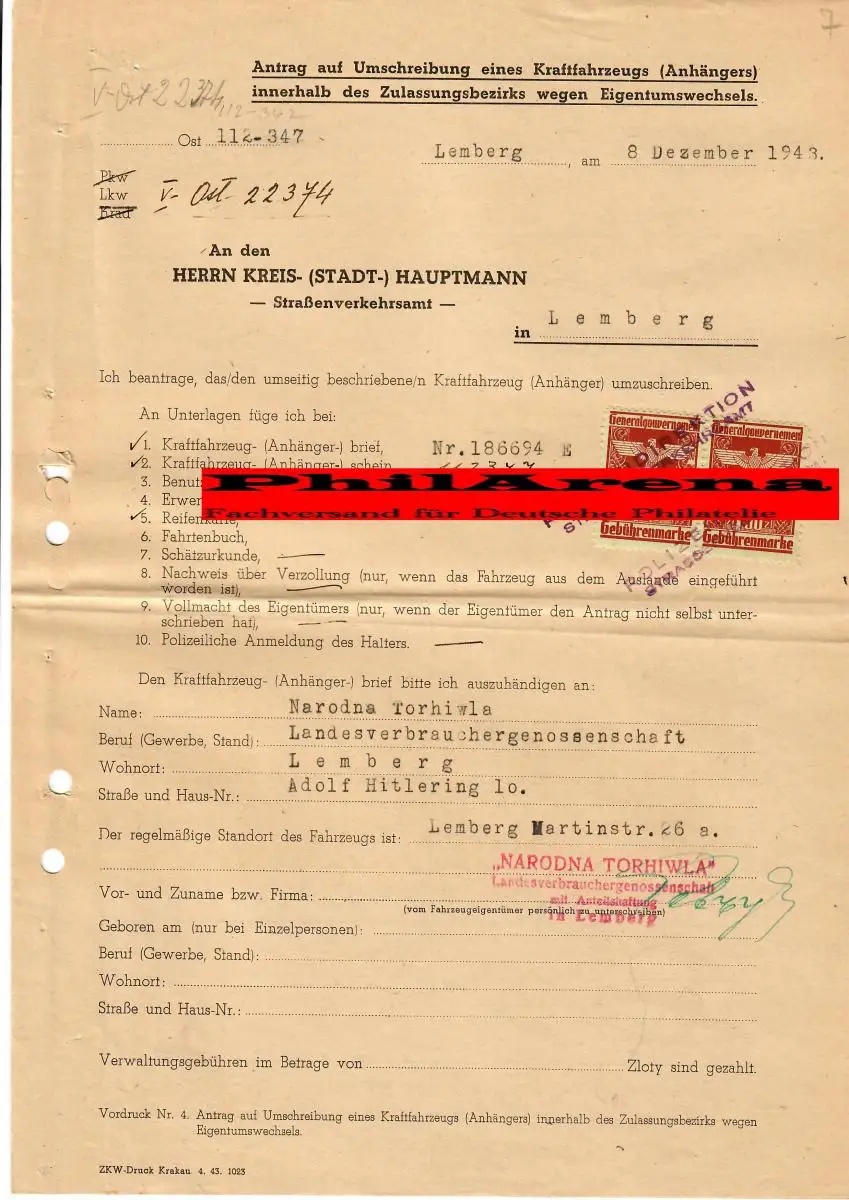 Umschreibung eines KFZ für die Landesverbrauchsgenossenschaft Narodna Torhiwla,Lemberg mit 3 Zloy Gebühren über Gebührenmarken.