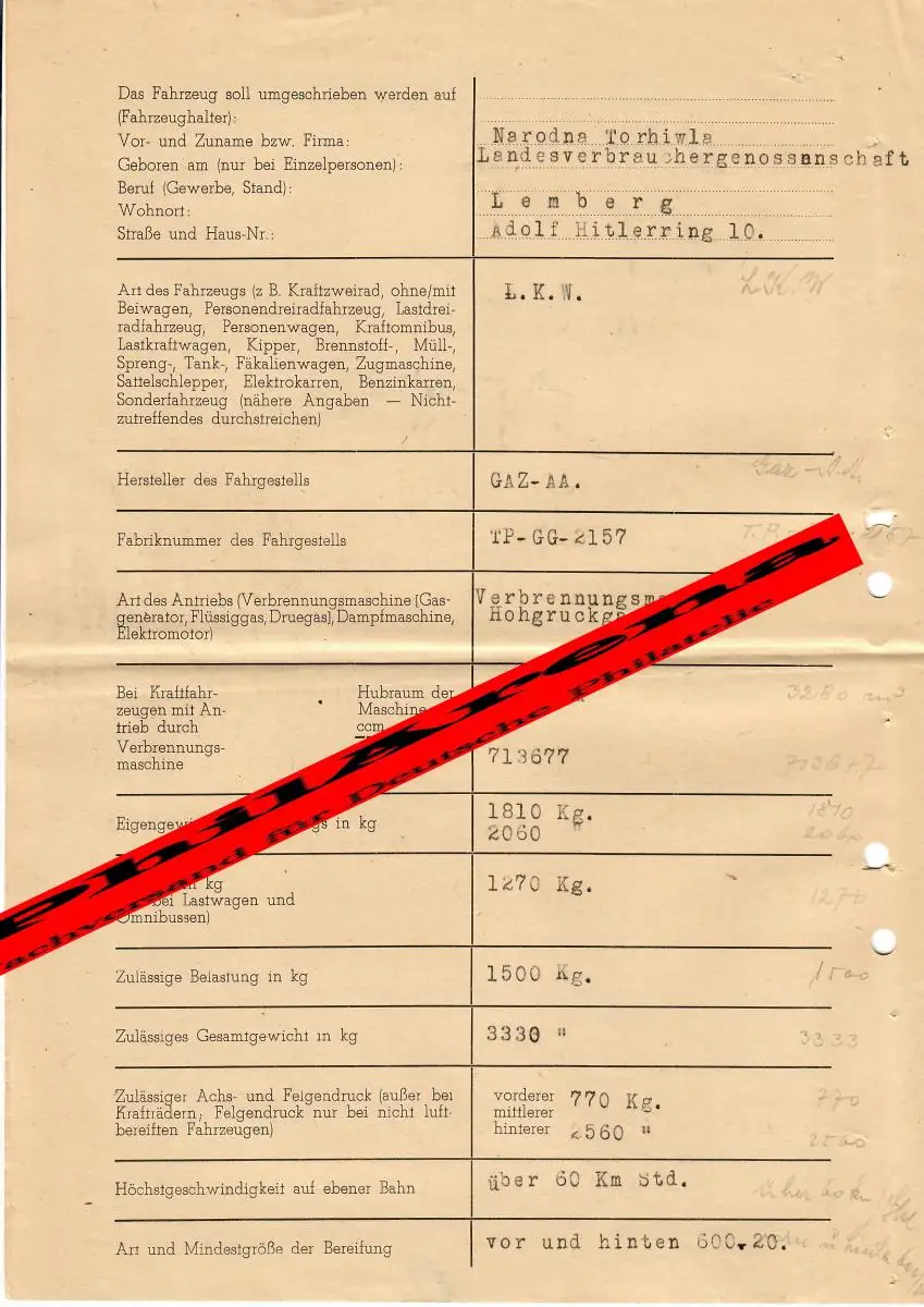 Generalgouvernement GG: Antrag Umschreibung LKW GAZ-AA, Lemberg 1943