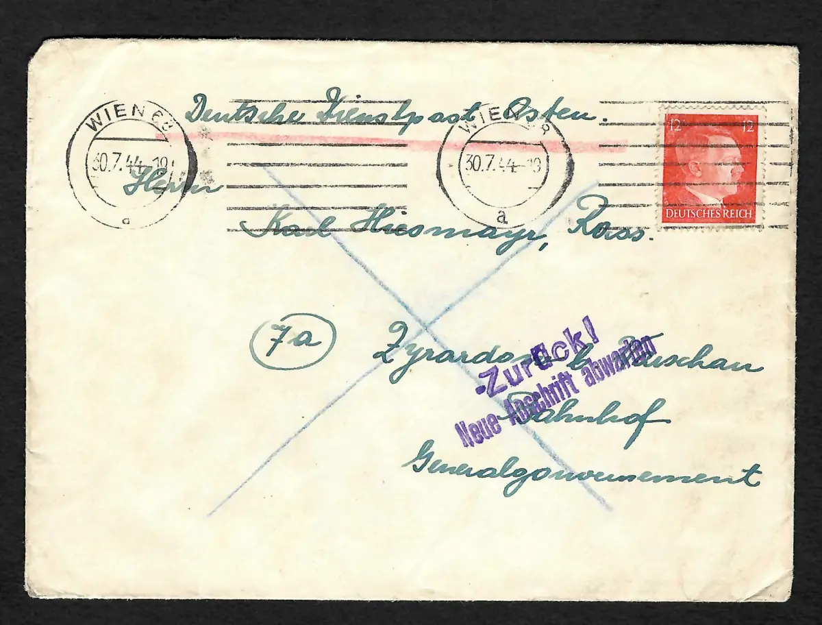 Ab Anfang 1944 wurde das Generalgouvernement sukzessive von den Russischen Truppen besetzt. Deutsche Truppen gaben auf dem Rückmarsch Städte auf, Post konnte nicht mehr befördert werden. Die Postwege waren noch frei, die Postleitzahl steht drauf. Aber als der Brief in Warschau ankam began gerade ab 1. August der Warschauer Aufstand wo die russichen Truppen am anderen Flussufer auf den Ausgang der Kämpfe warteten. Der Brief konnte zu dieser Zeit nicht zugestellt werden.