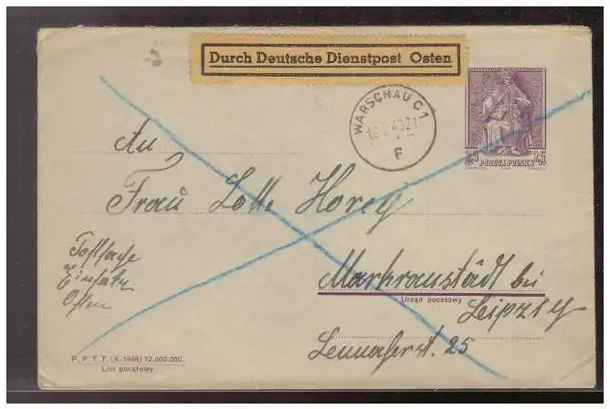 GG (009059) Polnischer Ganzsachenumschlag U11 ohne Überbalkung gelaufen Durch Deutsche Dienstpost Osten 1940