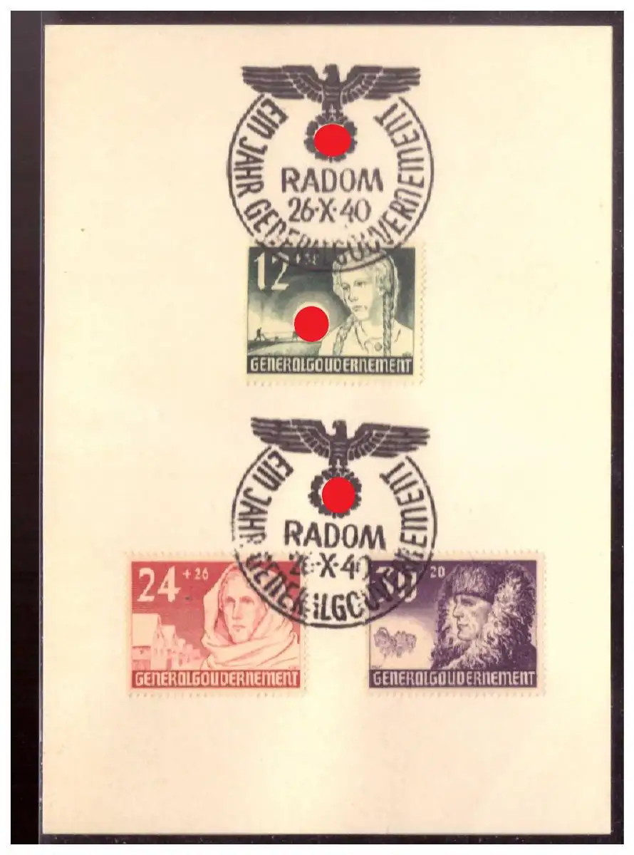 GG (009843) WKII Gedenkblatt mit MNR 56/ 58 mit Sonderstempel 6 Ein Jahr GG, Random 26.10.1940, Mängel