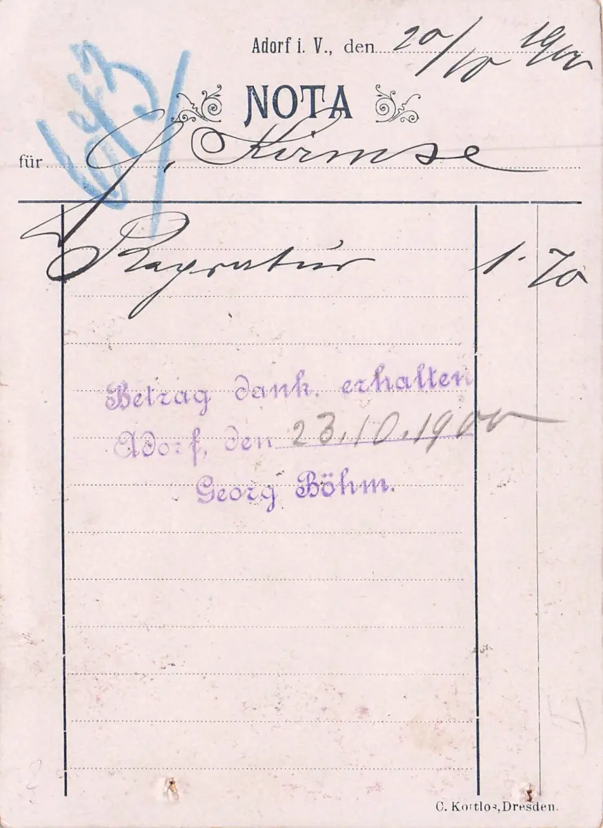 Georg Böhm Schuhmachermeister Schuhwaaren-Lager Wiener u. deutscher Fabrikate. Anfertigung nach Maass. Reparaturwerkstatt. Adorf i. V., Hauptstr. 14. -797884