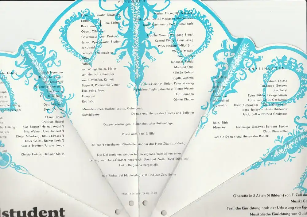 Musikalische Leitung: Ulrich Hermann. Inszenierung: Jürgen Maschwitz. Ausstattung: Ute Krajewski. Mitwirkende: Marion Fricke / Illa Schikora, Marion Herrmann / Marianne Weißenborn, Karin Astermann / Helga schollbach, Joachim Grund / Wolfgang Siegel, Konrad König / Klaus Ossig, Peter Hedwig / Milos Sich, Werner Mende, Johannes Rehde, Manfred Otto, u.a. - Theaterprogramm, Opernprogramm, Ballettprogramm, Musicalprogramm, Konzertprogramm, Theatermemorabilia, Programmhefte Sammlung, deutsche Theatergeschichte.