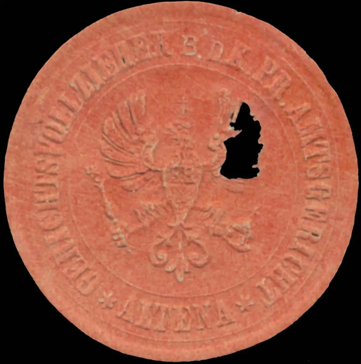 rot, geprägt, Größe/Zustand: 3 , beschädigt, Original Verschluss-Siegelmarke aus Papier welche früher von Behörden, Firmen etc. zum Versiegeln der Briefe benutzt wurden