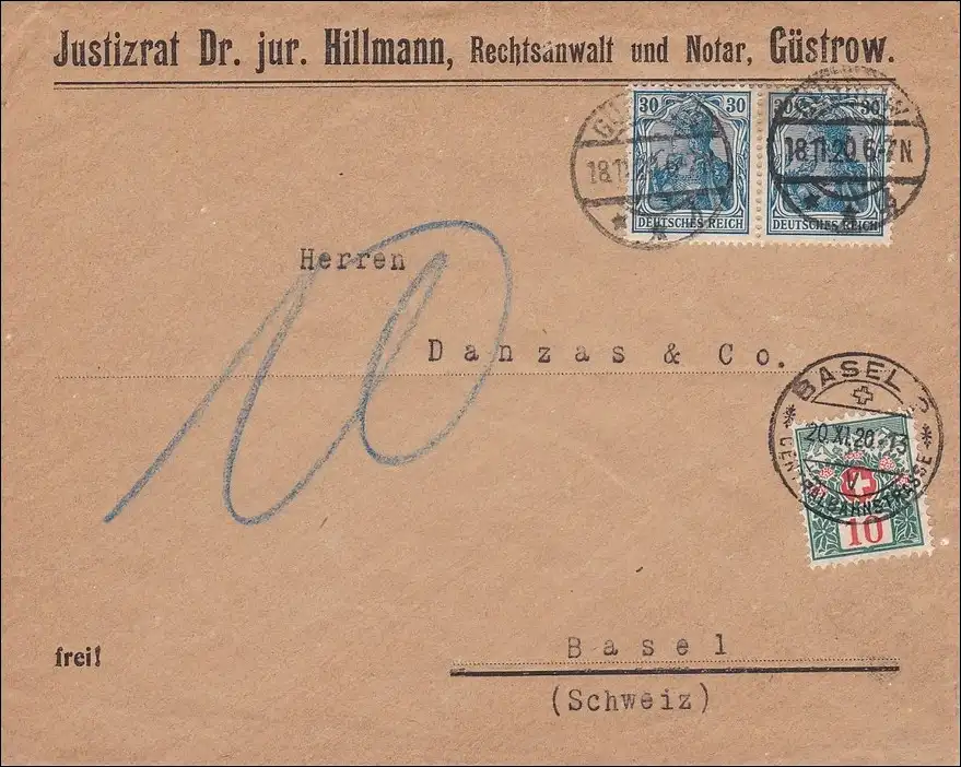 Germania: Brief Justitzrat von Güstrow nach Basel 1920 - Nachgebühr