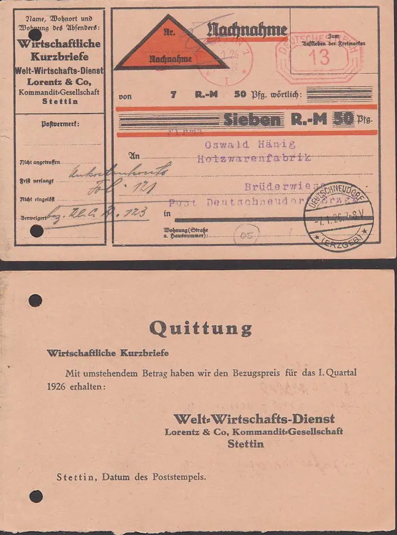 Germany Nachnahme aus Stettin nach Brüderwiese DEUTSCHNEUDORF mit PSF 13 Pf. 1926, rs. Quittung