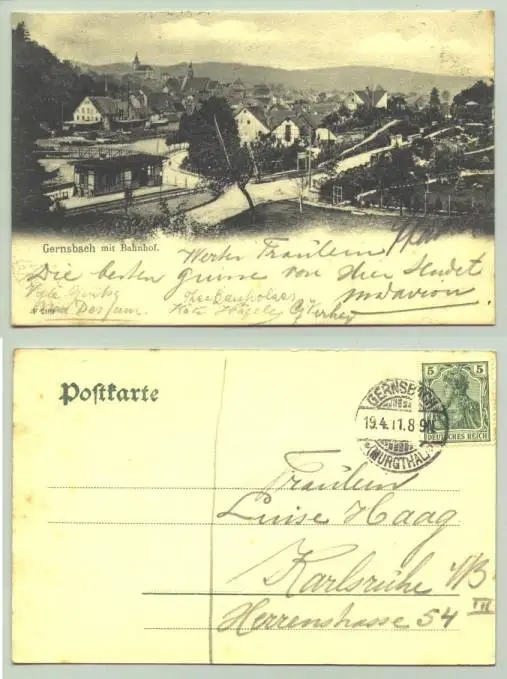 Artikelbeschreibung u. Zustand : Siehe Scan. Weitere Infos : Ansichtskarte. Gernsbach mit Bahnhof. PLZ-Bereich pauschal 76593. Postalisch gelaufen 1911