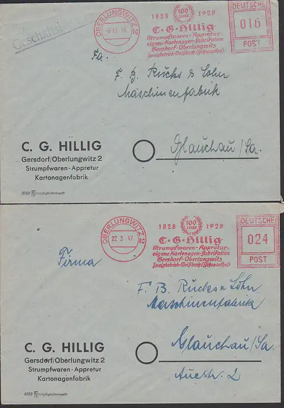 Gersdorf Oberlungswitz, 2 AFS 1946, 1947 der Fa. C. G. Hillig,, Strumpfwaren 16 und 24 Pfg. Freimachung