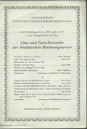 Gesellschaft zum Studium der Kultur der Sowjetunion: Programmzettel zum Konzert des Chor- und Tanz-Ensembles der Sowjetischen Besatzungsarmee in der Kongreßhalle des Zoo am 4. März 1948. Künstlerischer Leiter: Major Schejnin.