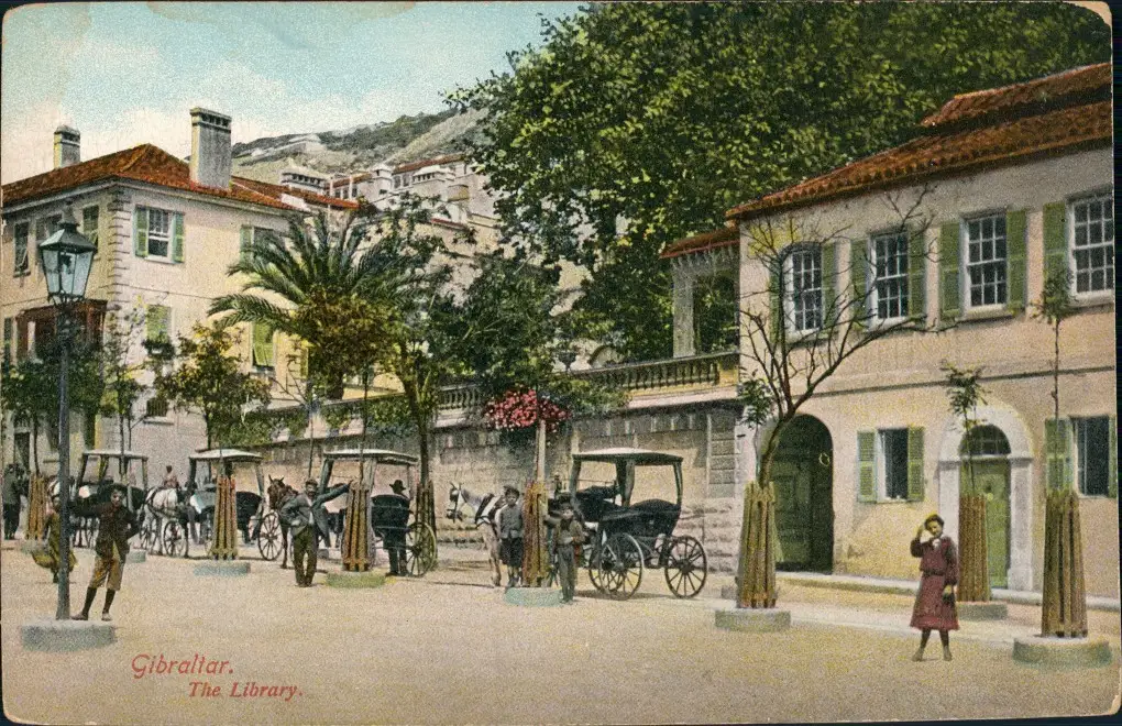 Gibraltar Strassen Partie Bücherei, Pferde Kutschen, Library 1910