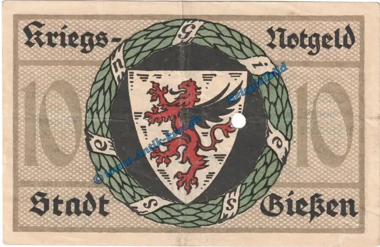 Banknote , Notgeld über Zehn Mark der Stadt Giessen , GrossnotgeldBundesland : Hessen  ,  Geiger : 178.02