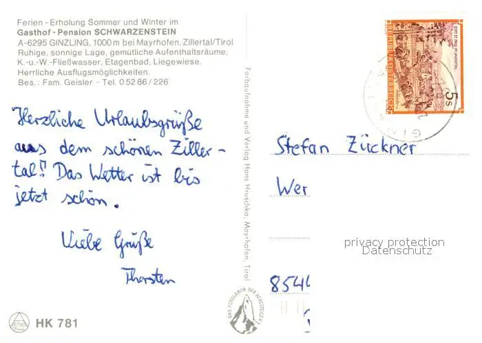 Ginzling Gasthof Pension Schwarzenstein Restaurant Ginzling postalisch gelaufen nach 1965 Erhaltung siehe scans [FriedD77] Frierer