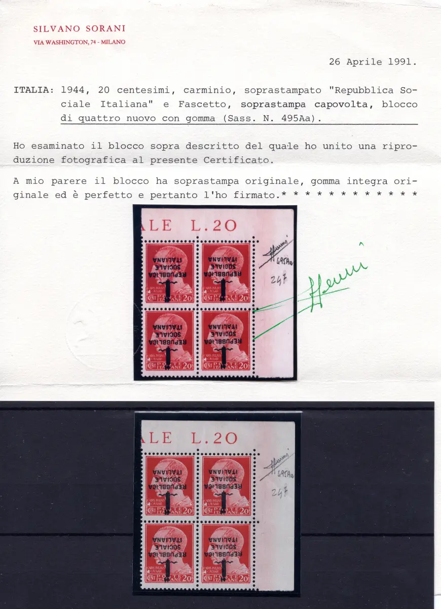MNH - Vollgummi - - Giulio Cesare Nr. 495Aa prächtiges Viertel a. von f. umgedrehter Aufdruck - Selten - Zert. Sorani - Kat. euro 5.000 Cod.362/182