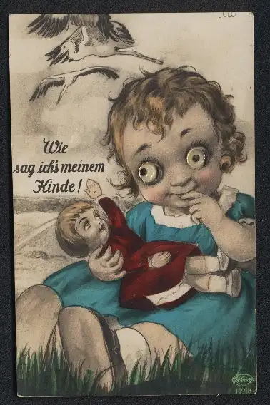 Glasaugen-AK Mädchen mit Puppe auf einer Wiese
