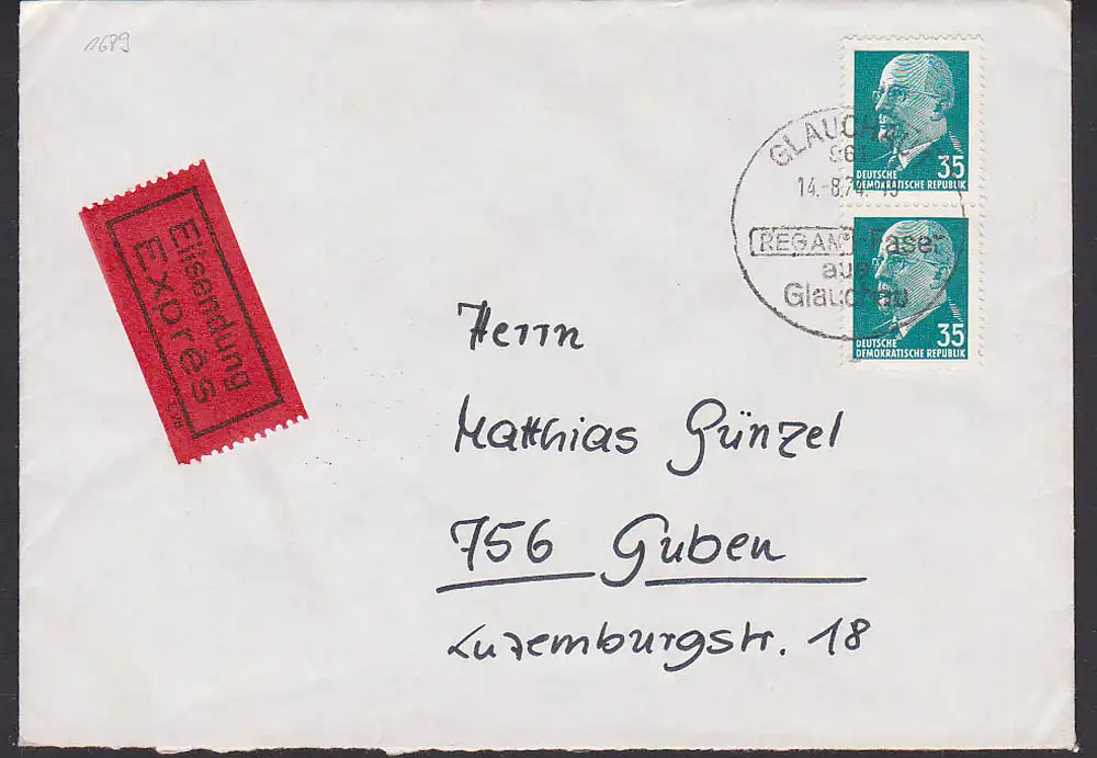 Glauchau 35 Pfg. Walter Ulbricht auf Eil-Brief SSt. Regan - Faser (1689)