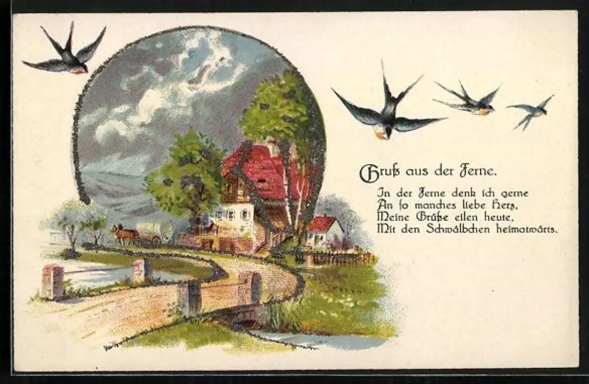 Glitzer-Perl-AK Brücke über einem Bächlein mit Schwalben