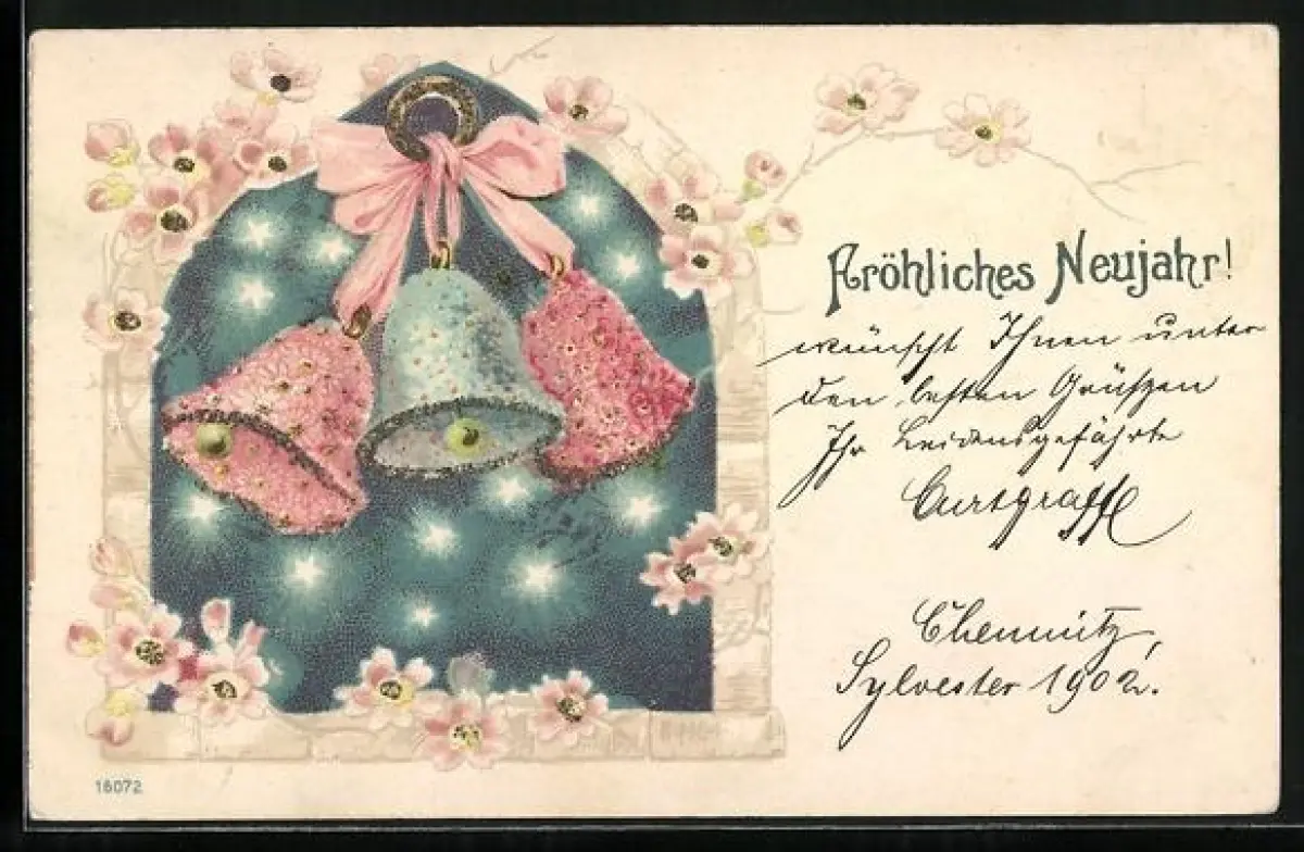 Glitzer-Perl-AK Drei Glocken aus Blumen mit Glitzer-Perlen, Fröhliches Neujahr