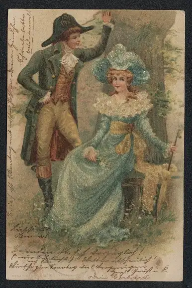Glitzer-Perl-AK Edel gekleidetes junges Paar, ihr Kleid mit Glitzer-Perlen