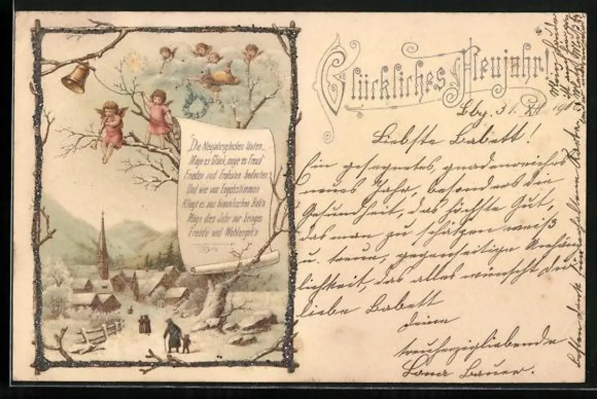 Glitzer-Perl-AK Engel in einem Baum über einem verschneiten Dorf, Rahmen mit Glitzer-Perlen