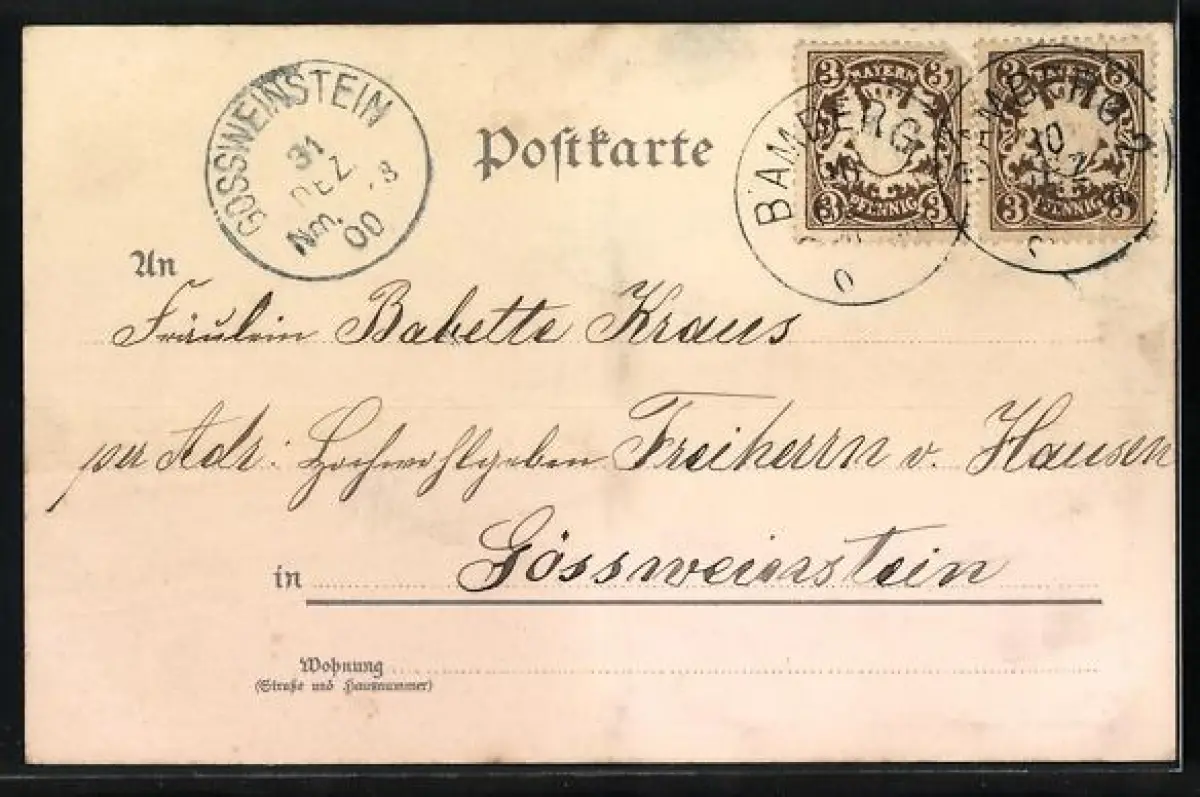 Personenbezogene Daten auf der Rückseite der Karte wurden durch blauen Textmarker unkenntlich gemacht. Die blauen Stellen sind auf die Vorderseite durchgeweicht und wirken sich negativ auf das Postkartenfoto aus
