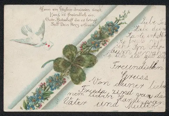 Glitzer-Perl-AK Fliegende Brieftaube, Kleeblatt und Vergissmeinnicht mit Glitzer-Perlen