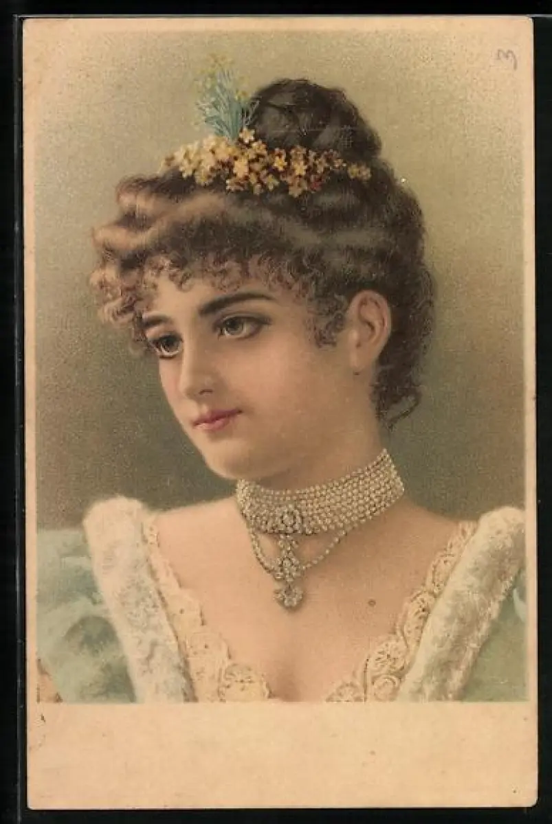 Glitzer-Perl-AK Frauenporträt mit Perlenschmuck