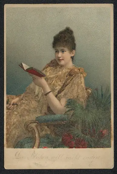 Glitzer-Perl-AK Junge Frau mit einem Buch in der Hand, mit Glitzer-Perlen