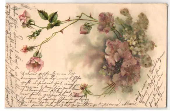 Glitzer-Perl-AK Rosenblüten am Zweig