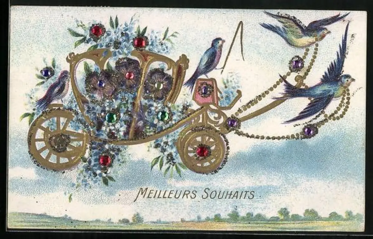 Glitzer-Perl-AK Schwalben ziehen eine Kutsche mit Blumen und mit Glitzer-Perlen