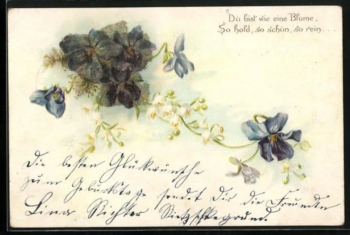 Glitzer-Perl-AK Veilchen mit Perlen und Gedicht