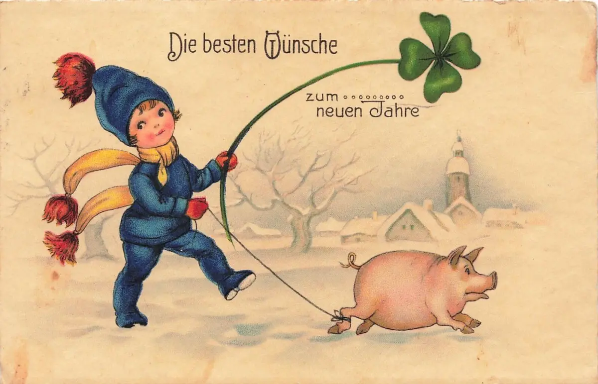 Glückschwein mit Junge in blau Sportanzug Neujahr Postkarte um 1930