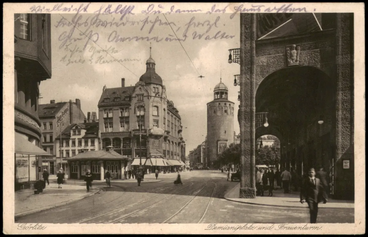 Görlitz Zgorzelec Demianiplatz, Kiosk - Geschäfte - belebt 1929