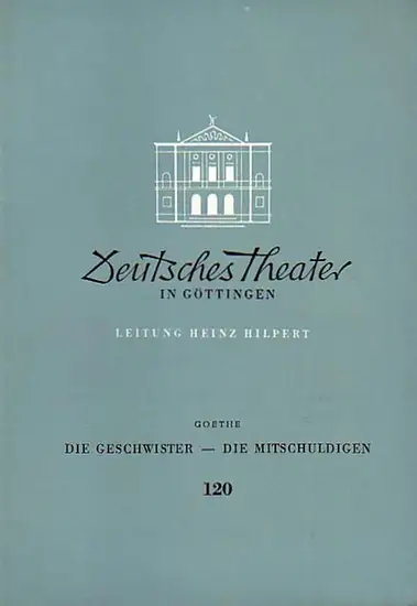 Titel: Die Geschwister - Die Mitschuldigen. Programmheft für 1957 / 1958. (= Blätter des Deutschen Theaters in Göttingen VIII. Jahr Heft 120). Darsteller: Klaus Behrendt, Lizzi Reisenberger, Marianne Prenzel, Hermann Motschach, Camillo Kossuth u.a. Regie: Martin Ankermann, Bühnenbild: Wilhelm Preetorius, Kostüme: Gudrun Fienbork. Weiterer Inhalt: Goethe: Einschränkung, H. v. Hofmannstahl: Repertoire, Goethe: Die Welt der Mitschuldigen, J. Paul: Mißwachs an Lustspielen, A. W.Schlegel: Das Wesen des Dialogs, R. Musil: Wenn die Kritiker, Goethe: Maximen und Reflexionen, Goethe: Das Schreien, Nach- und Hinweise