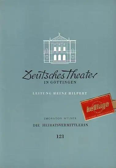 Titel: Die Heiratsvermittlerin. Programmheft für 1957 / 1958. (= Blätter des Deutschen Theaters in Göttingen VIII. Jahr Heft 121). Darsteller: Joachim Wichmann, Eugen Bergen, Angela Salloker, Karl-Heinz Gerdesmann, Ilse Künkele u. a. Regie: Horst Loebe, Bühnenbild: Jan Schlubach, Kostüme: Gudrun Fienbork. Weiterer Inhalt: T. Wilder: Mr. Brush glaubt nicht an Zinsen, H. Sahl: T. Wilders Heiratsvermittlerin, C. Fry: Meine Erfahrungen mit der Theaterkritik, R. Goldstone: Gespräch mit T. Wilder, Ur- und Erstaufführungsdaten der Dramen Wilders. Wilder in deutscher Sprache, Literatur über T. Wilder, Nach- und Hinweise