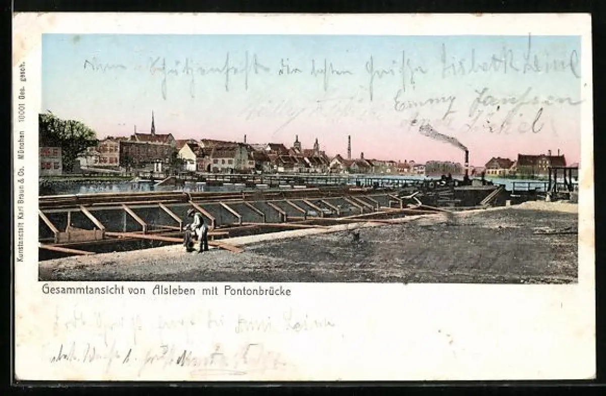 Goldfenster-AK Alsleben / Saale, Gesamtansicht mit Pontonbrücke