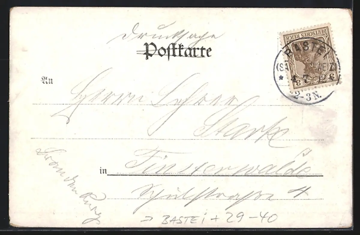 Personenbezogene Daten auf der Rückseite der Karte wurden durch blauen Textmarker unkenntlich gemacht. Die blauen Stellen sind auf die Vorderseite durchgeweicht und wirken sich negativ auf das Postkartenfoto aus