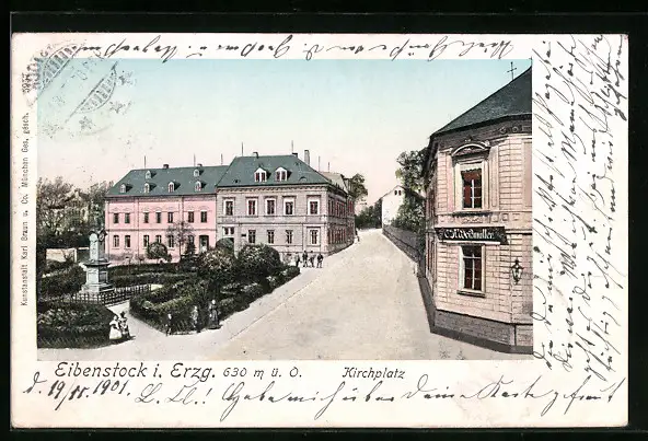Goldfenster-AK Eibenstock i. Erzg., Kirchplatz mit Gasthaus und Denkmal